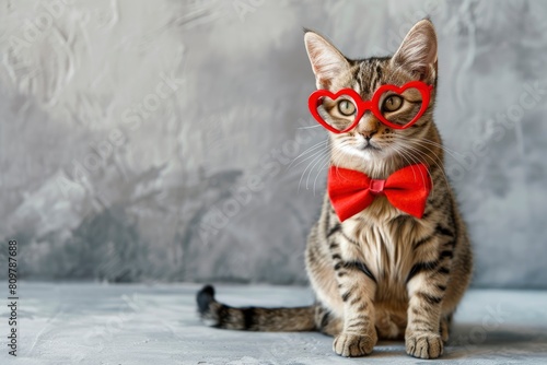 Adorable cute cat wearing red heart-shaped glasses and bow tie sitting on gray background and looking at the camera. Valentine's day greeting card with beautiful pets. Copy space with generative ai