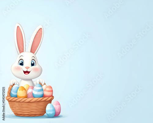 Adorable Easter bunny in a basket with colorful eggs, ample copy space