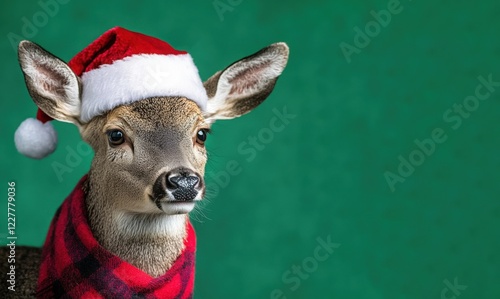 fawn, foulard, christmas, festive, cute, green background, holiday, cervid, winter, celebration, costume, animal, playful, joyful, adorable, seasonal, decoration, charme, whimsy, warmth, nature, cheerful, tradition, spirit, endearing, character, cosy, charming, forest, fun, innocence, merry, christmas, delightful, happy, vibrant, jolly, scene, reindeer, santa, rudolph, funny, claus, hat, antler, card, santa