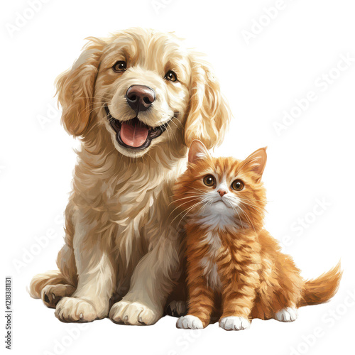 golden retriever, puppy, kitten, cat, dog, pet, animal, friendship, friends, best friend, cute, adorable, fluffy, furry, playful, happy, joyful, love, companionship, loyal, sweet, cream, beige, orange, brown, white, paw, whisker, tail, black background, animal portrait, digital artwork, painting, illustration