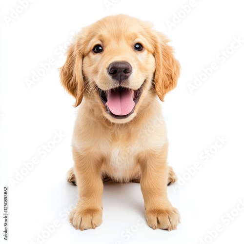 Adorable golden retriever puppy sitting and smiling happily on a white background with bright eyes and fluffy fur