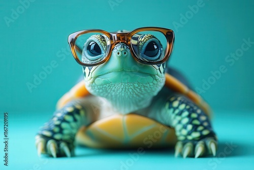 adorable green turtle with trendy glasses poses charmingly against a playful studio background radiating cuteness and character perfect for a childrens themed illustration