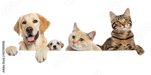 Adorable Group of Domestic Animals Peeking Over Edge featuring Golden Retriever Puppy and Two Cats in a Humorous and Engaging Composition for Pet Lovers