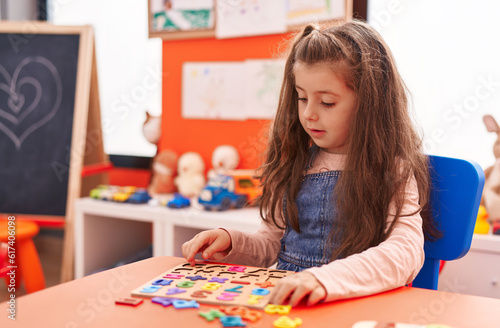 Adorable hispanic girl playing with maths puzzle game sitting on table at kindergarten