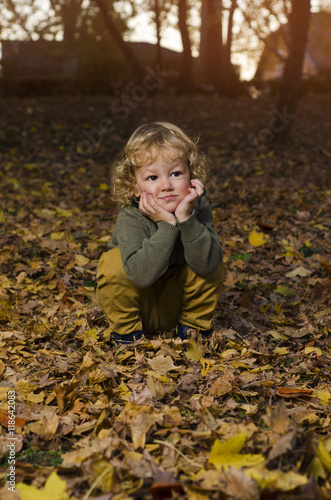 adorable, autumn, leaf, fall, children, cute, caucasian, boy, blond, children, curly, face, funny, hair, kneeling, lifestyle, little, nature, outdoors, park, people, season, small, sweater, wondering
