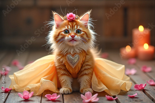 kitten, dress, persian, adorable, fluffy, playful, charming, whimsical, fairy tale, romantic, elegant, celebration, creative, artistic, fantasy, flower petals, candle, dreamy, sweet, floral, heartwarming, pink petals, rustic, luxury