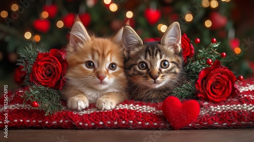 Adorable Kittens Surrounded by Red Roses and Heart Decorations with Festive Background Lights
