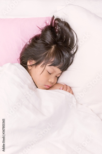 adorable little asian girl sleeping on the bed with white blanket