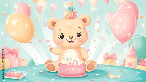 Adorable Little Bear's First Birthday Party Vector Illustration