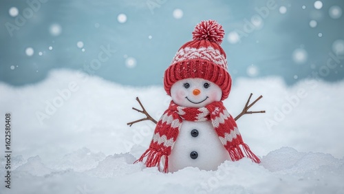 Adorable mini snowman toy surrounded by dense snow, sporting a woolen hat and scarf