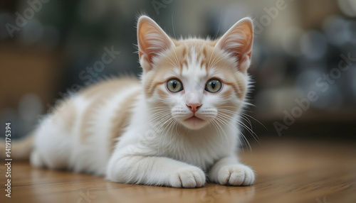 kitten, cat, cute, adorable, orange, white, fluffy, paw, eye, fur, pet, animal, small, young, playful, felino, lovely, sweet, charming, innocent, beautiful, baby, domestic, mammal, companion, furry, soft, wallpaper, background, photograph, image, picture, photo, cat, meow, purr, home, house, floor, wood, indoor, closeup, portrait, sharpened, gaze
