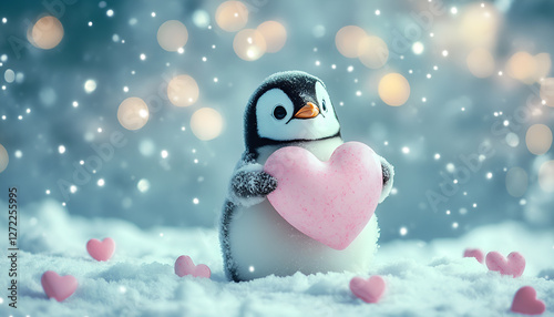 Adorable penguin chick holding heart in snowy landscape with heart shaped lights