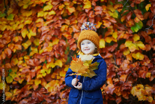 Adorable preschooler girl enjoying nice and sunny autumn day outdoors