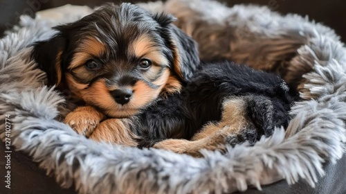 puppy, dog, sleeping, bed, cute, adorable, furry, fluffy, brown, black, tan, paw, eye, small, sweet, cosy, comfortable, resting, relaxed, peaceful, tranquil, calm, quiet, warm, soft, nestled, happy, content, playful, young, animal, pet, canino, friends, love, home, comfort, security, sleep, nap, dreaming