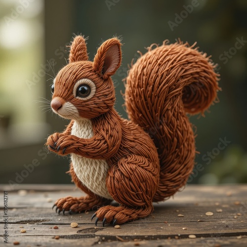 Adorable Red Squirrel Figurine Crafted from Yarn Sitting on Wooden Table