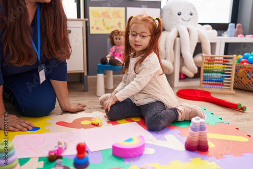 Adorable redhead girl playing with toys sitting on floor at kindergarten