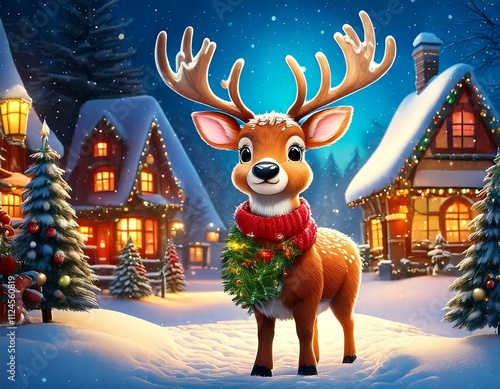 Adorable renne cartoon habillé de Noël avec sapin dans un village enneigé Generated image