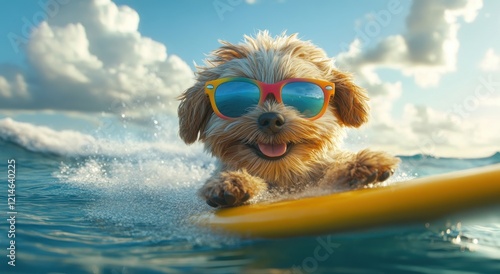 Adorable Small Dog Surfing on a Bright Yellow Surfboard in Brightly Colored Sunglasses Under a Clear Blue Sky with Fluffy White Clouds on a Warm Sunny Day