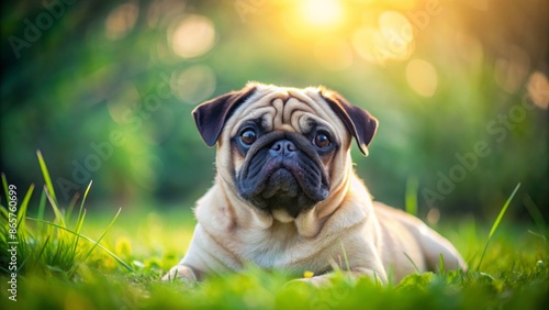 Adorable small pug dog with wrinkles and curved tail lying on lush green grass with blurred natural background scenery outdoors.