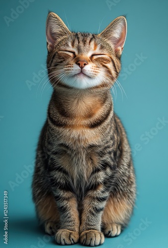 Adorable tabby cat with closed eyes and content expression against a bright blue background capturing the essence of feline joy and tranquility