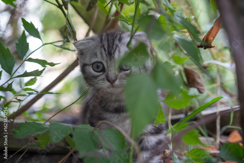kitten, cat, tabby, cute, pet, animal, curious, adorable, felino, young, baby, small, portrait, animal portrait, domestic, looking, outdoors, nature, grey, black, stripes, furry, fluffy, little, hiding, leaf, branch, garden, eye, expression, candid, bokeh, sweet, innocent, cat, playful, wild, stealth, exploration, discovery
