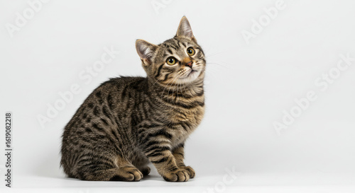kitten, cat, tabby, brown, cute, pet, animal, felino, domestic, mammal, young, adorable, striped, fur, whisker, eye, paw, sitting, looking, upward, attentive, curious, small, studio, portrait, isolated, background, white, carnivore, predator, hunter, playful, innocent, soft, fluffy, beautiful, lovely, charming, sweet