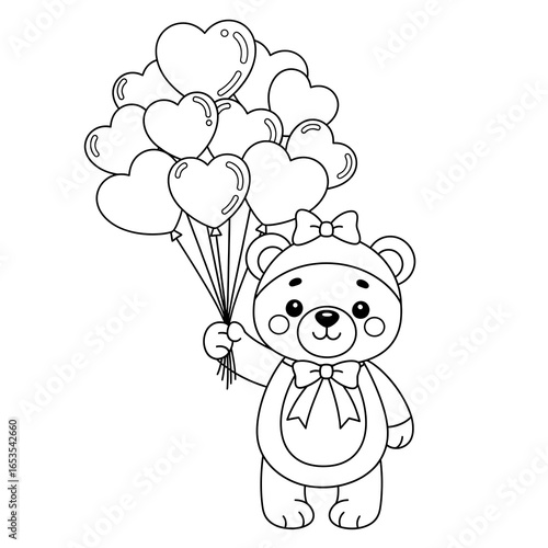 Adorable Teddy Bear with Heart Balloons: Line Art, Cute, Valentine's Day Design