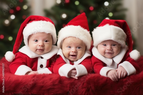 adorable, three, santa, baby, capturing, joy, triplet, holiday, festive, cute, little, happy, christmas, children, sibling, playful, laughter, smile, jolly, present, winter, magical, wonder, family, love, joyous