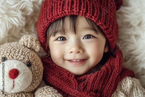 toddler, girl, baby, children, cute, adorable, winter, knit up, hat, foulard, red, beige, teddy bear, cuddly, fluffy, smiling, happy, cheerful, warm, cosy, soft, sweet, innocent, playful, fun, childhood, portrait, photo, love, affection, family, holiday, christmas, new year