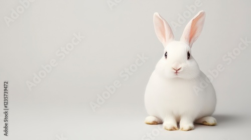 Adorable White Rabbit Sitting Calmly on a Light Gray Background in Studio Setting