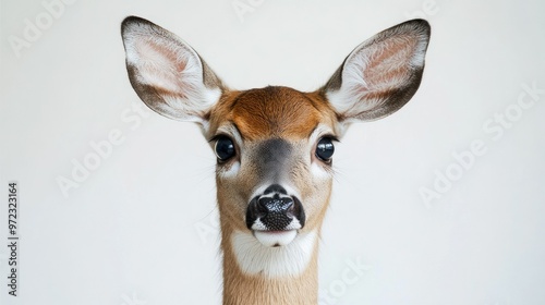 Adorable white-tailed doe with large, gentle eyes, posed against a clean white backdrop, embodying serene wildlife beauty