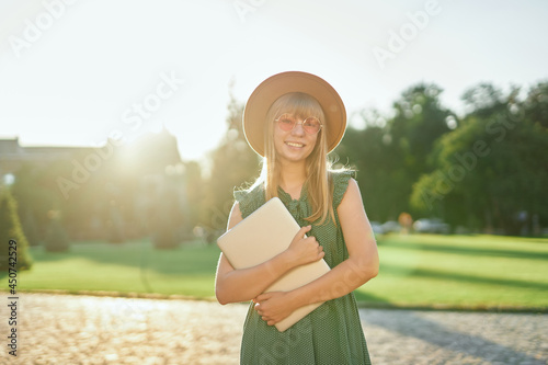 Adorable young blonde university or college student girl with laptop wearing green dress and hat in university campus. Happy female school or student, educational concept. High quality image