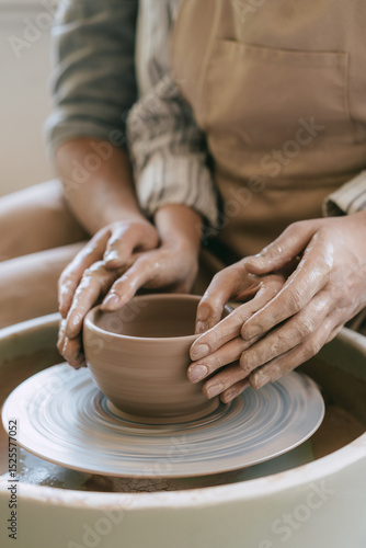 Adult and child hands shaping clay on pottery wheel