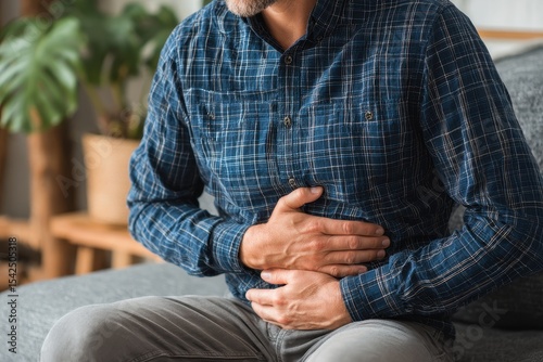 Adult man at home experiencing intense abdominal pain he clutches his stomach possibly due to diarrhea or indigestion