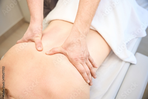 Adult patient receiving mid-back massage performed by masseur