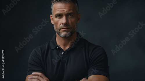 Adult thirties male bodyguard in black polo shirt, posing confidently on a plain backdrop