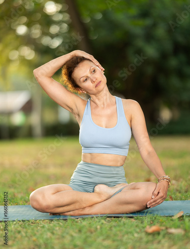 adult, woman, female, 40s, caucasian, european, lifestyle, hobby, outdoors, action, exercise, fit, health, gymnastics, training, pose, yoga, stretch, pilates, relaxation, balance, flexibility, mat, flexible, activity, activewear, sporty, class, asana, well-being, recreation, concentration, practicing, outfit, strength, flow, tension, park, grass, summer, breath, lotus