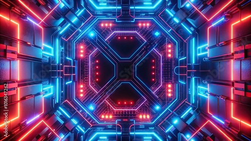 advanced, circuitry, futuristic, red, blue, neon light, symmetric
