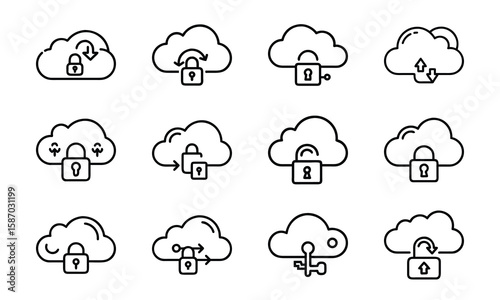 Advanced Cybersecurity and Digital Privacy Icons Set Featuring Cloud Security, Password Protection, Encryption, Biometric Access, Network Safety, and Data Defense Symbols