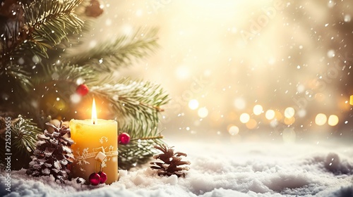 Advent candle, fir tree branches and holiday decorations in snow against light garland background. Copy space for text.
