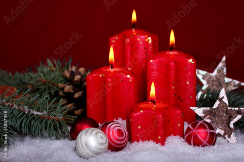 advent, fourth, 4, candle, burn, christmassy, fir cone, star, star, advent, pensive, sting, decoration, festive, gloss, gleam, evening, candle, candlelight, candlelight, luminescent, light, light, horizontal format, red, fir, christmas, snow, number one, ball, christmas bauble, red, white