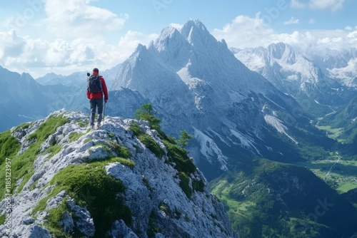 adventure, mountain, hiking, landscape, nature, traveler, rock, sky, snow, peak, person, view, summer, sunlight, exploration, vale, greenery, ridge, altitude, cloud, serene, activity, wilderness, scenic, journey, thrill, freedom, recreation, terrain, solitude, environment, fresh air, vibrant, blue, peaceful, breathtaking, natural beauty, rugged, explorer, trekking, vista, panoramic, healthy lifestyle, motivational