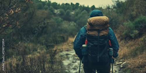 Adventurous hiker navigating a rugged trail in a forest during a cloudy day