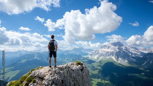 Adventurous Hiker Standing on a Mountain Peak Overlooking a Vast and Breathtaking Landscape : Generative AI