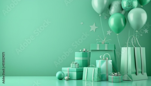 Advertising sale including podium, present boxes, shopping bag and balloons isolated on a simple green backdrop with lots of space to display writing, Generative AI.