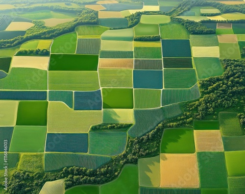 Aerial Abstract Patchwork of Farmland with Geometric Shapes in Bright and Muted Greens