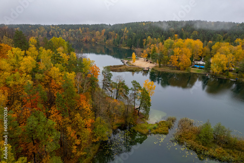 Aerial autumn fall view Green Lakes, Balsys Lake (Žalieji Ežerai) Vilnius, Lithuania