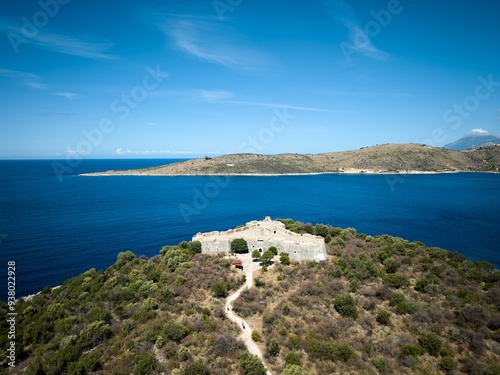 Aerial drone panorama landscape of Porto Palermo Castle (Albanian: Kalaja e Porto Palermos), near Himare in southern Albania