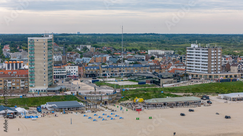 Aerial drone photo of the beach, boulevard and restaurants in the coastal town named Zandvoort in the Netherlands.