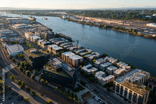 portland, oregon, industrial, sunset, drone, aerial, railway, train, track, building, river, willamette, city landscape, skyline, residential, ship, water, motion, evening, architecture, transportation, traffic, warehouse, dock, infrastructure, road, housing, us, urban, northwest, development, real estate, rooftop, sunlight, harbor, boat, container, city, shipping, logistic, west coast, freight, golden hour, warehouse, roadway